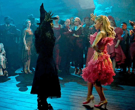 One of my favorite scenes is when Glinda shocks everyone by leaving the crowd to join Elphaba on the dance floor. Glinda’s horrified friends try to pull her back, fearing she is committing social suicide. But Glinda refuses, joining Elphaba by attempting to copy her dance. At first, neither the crowd nor Elphaba understands. Gradually, Elphaba becomes teary as they dance together. Glinda’s example sways the crowd, who shift from scorn to adoption of the dance themselves. Through this, Elphaba finds support in exploring herself. Even though Glinda still tries to make her over in her own image, Elphaba has enough inner security to follow her own North Star.